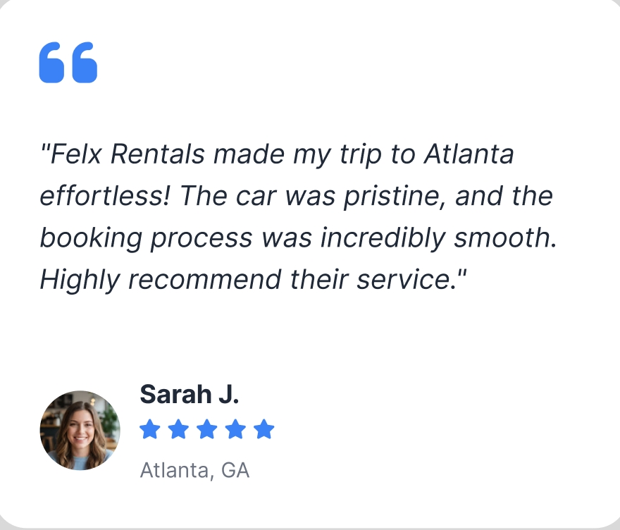 Felx Inc Rentals is a Georgia-based company dedicated to making your travel simple, comfortable, and reliable. From everyday commutes to special occasions, our diverse fleet and customer-first approach ensure you always have the perfect ride. We are proud to serve our community with transparent pricing and exceptional service, every time.